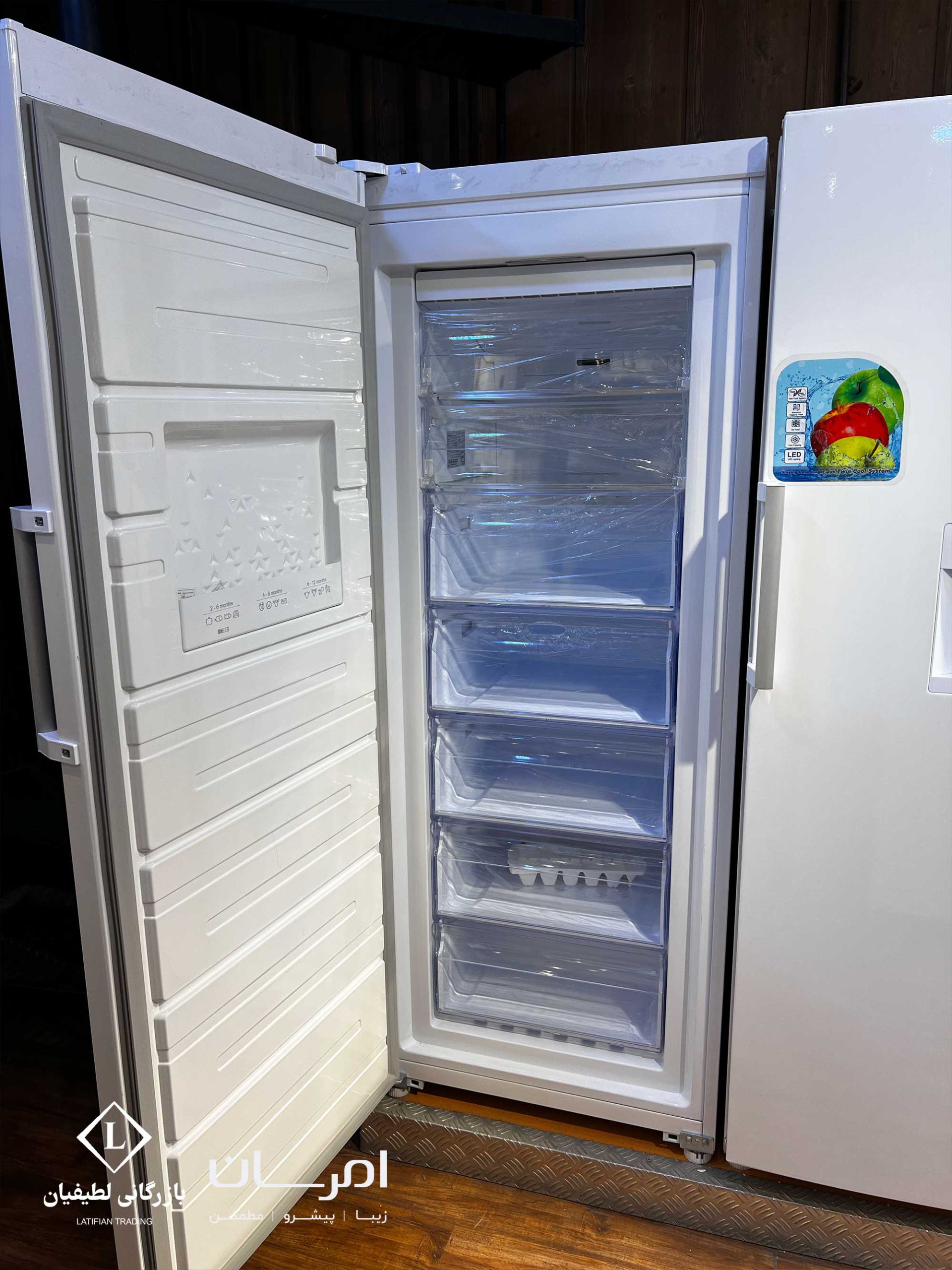 گنجایش فریزر 183 لیتر میباشد و میتوان مواد غذایی زیادی را در آن منجمد و به مدت طولانی نگهداری کرد. در فریزر هفت طبقه بزرگ تعبیه شده که به دلیل جادار و بزرگ بودن فریزر مقدار زیادی از مواد غذایی (گوشت, سبزیجات و…) را داخل نایلون یا ظروف به صورت بسته بندی میتوانید قرار دهید و آن را برای مدت طولانی منجمد نگه دارید. بر روی در فریزر نیز یک طبقه در نظر گرفته شده که میتوان بسته های کوچک مواد غذایی و انواع بستنی را در آن نگهداری کرد. در فریزر هم هر کشو دارای تنظیمات کنترل رطوبت است که به راحتی تمام و صرفاً با بستن یا باز نگه داشتن نوار کنترل، درجه رطوبت بهینه را برای انواع موادغذایی میتوان تنظیم کرد و آنها را برای مدت زمان طولانی تازه نگه دارید.